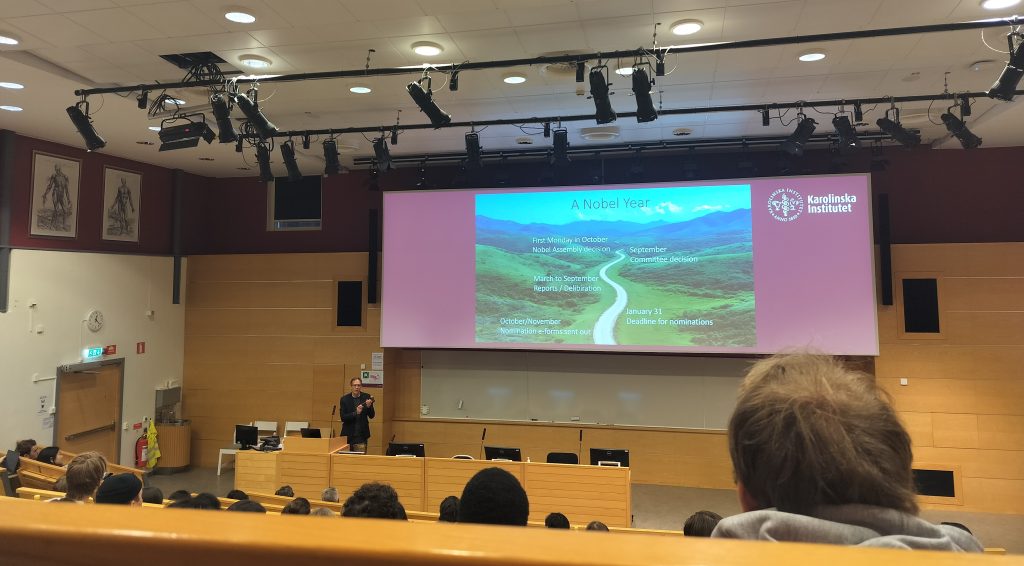 There is a very special lecture at KI every year – the Nobel lecture. Every year during the Nobel week, the laureate(s) of the Nobel Prize in Physiology or Medicine hold(s) a lecture that is open to all students at KI. Understandably, it’s a very well-visited lecture, so if you’re interested in going, it’s good to prepare yourself for queuing.